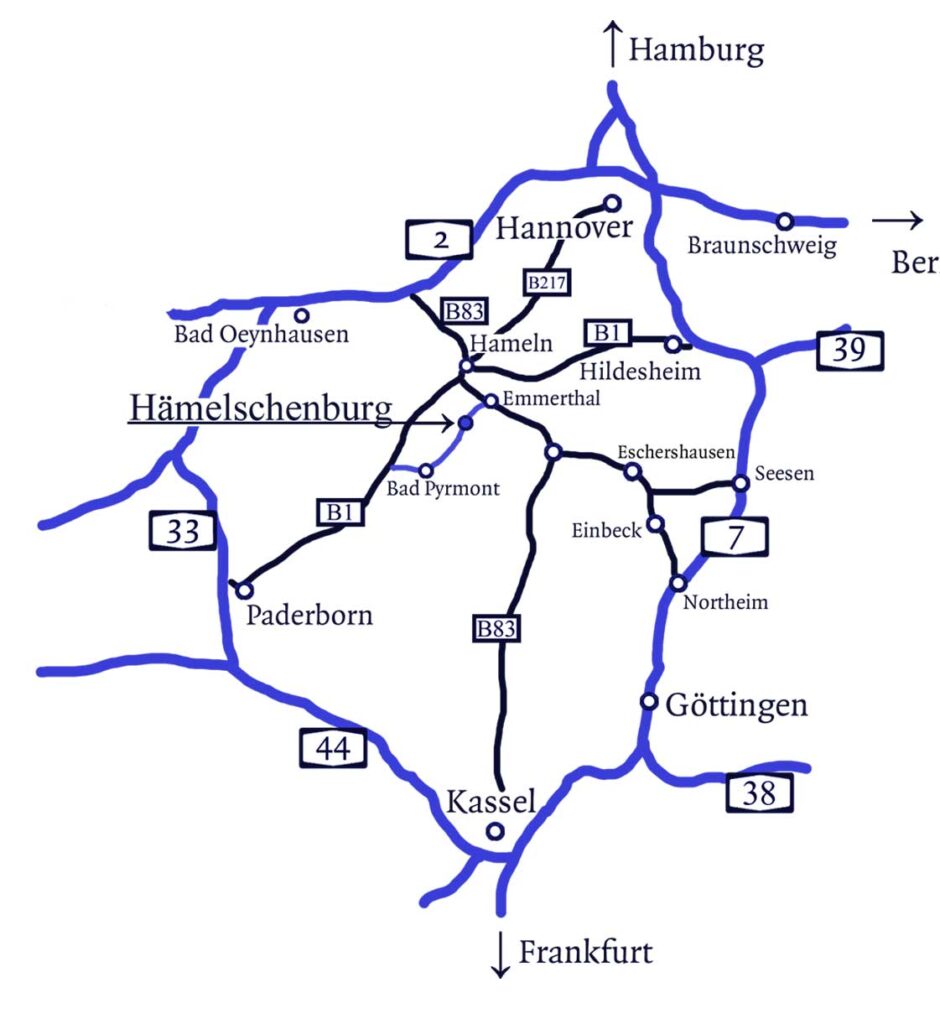 Schloss Hämelschenburg liegt etwa eine Autostunde süd-westlich von Hannover zwischen Hameln und Bad Pyrmont in der Gemeinde Emmerthal.